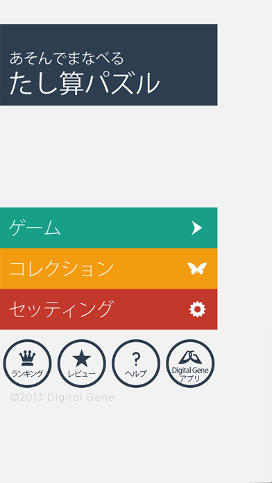 1~5までの数字から9までの答えを導き出すビギナーモード。1~9の数字で30までの数字を導きだすマスターモードまで幅広く用意してあるので、子供の算数の勉強から大人の脳トレにも使えるゲームです。