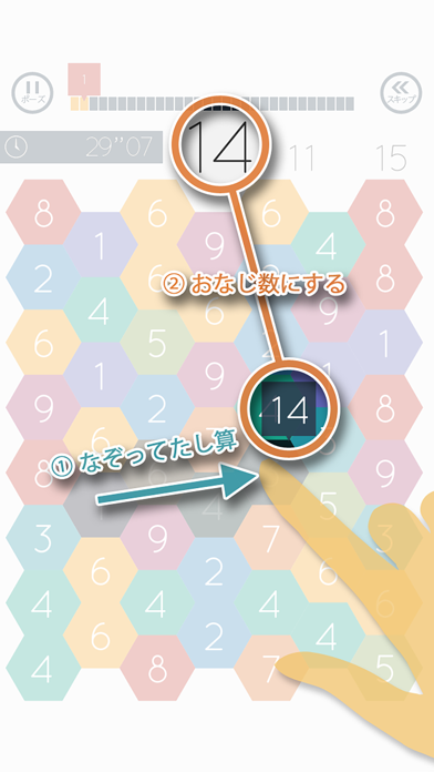 ハチの巣のように張り巡らされた数字のマスを、なぞることで答えを導き出すたし算ゲームです。