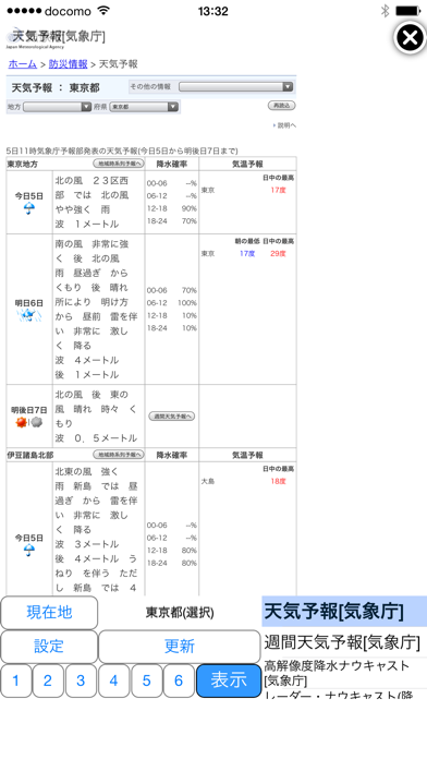 天気予報をじっくり見るタイプの方に本アプリはオススメ。じっくり見るということは、それだけ多くの情報を取得したいということですよね。本天気アプリは1画面で6つの天気情報を取得できるので、あらゆる気象情報を一度に取得することが出来ますよ。天候によっては落雷情報や雨量情報、衛生画面なども確認出来る高機能なお天気アプリです。