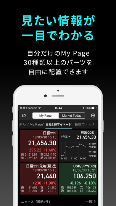 情報の効率的なキャッチアップに重きを置いた株取引アプリ。ホーム画面のパーツを変更して、資産の評価額や日経平均株価など、必要な情報を1画面にまとめて表示できます。銘柄の検索やチャートの分析も詳細に行えるため、注目すべき銘柄を見逃しません。