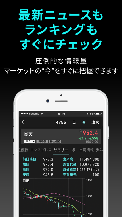 銘柄をお気に入り登録できて、100個以上の銘柄の推移をリアルタイムで見れる。また五分足、日足、月足、年足と比較が出来、株初心者にもやさしい。楽天口座であれば取引も出来る。