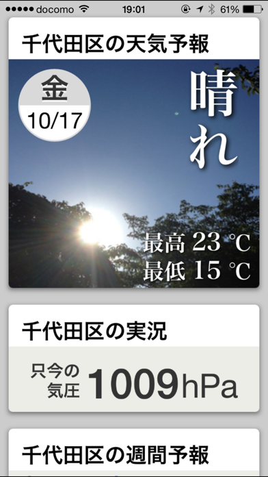 シンプルで使いやすい天気アプリ。大きめの文字サイズで視認性が高く、「天気予報」「週間予報」といったカテゴリごとにわかりやすく表示しています。