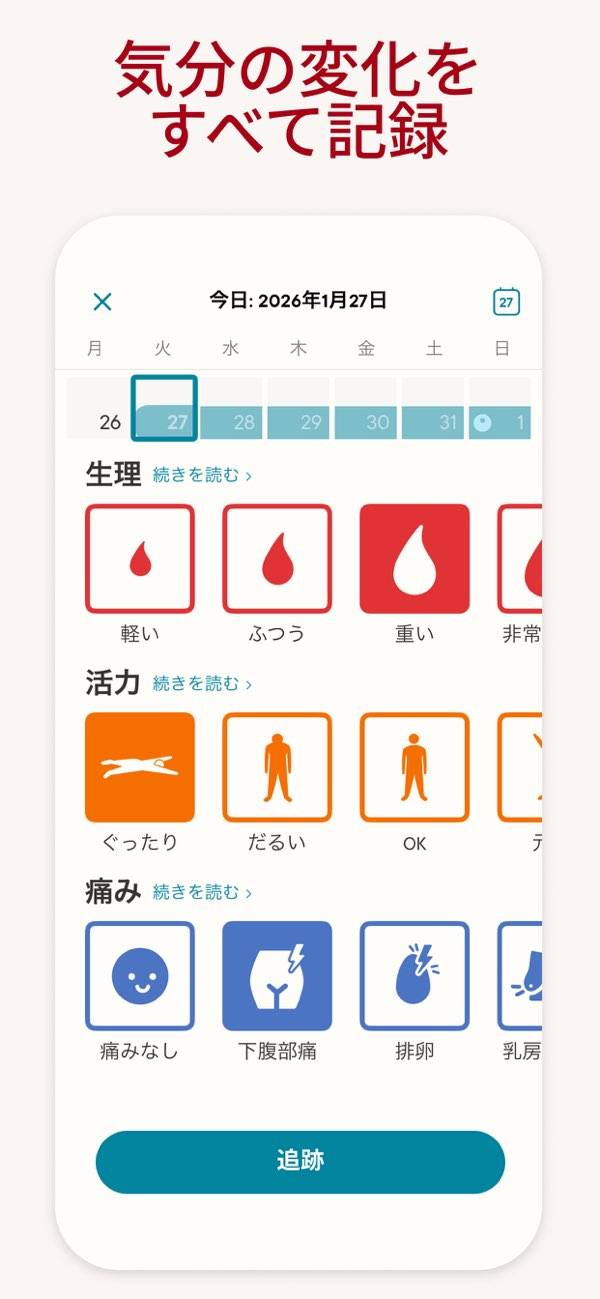 睡眠時間はどれくらいか、気分は沈んでないかなど、自分の体調に合うアイコンを選べます。すると体調の変化を読み取って、より正確な生理サイクルを予測することが可能です。