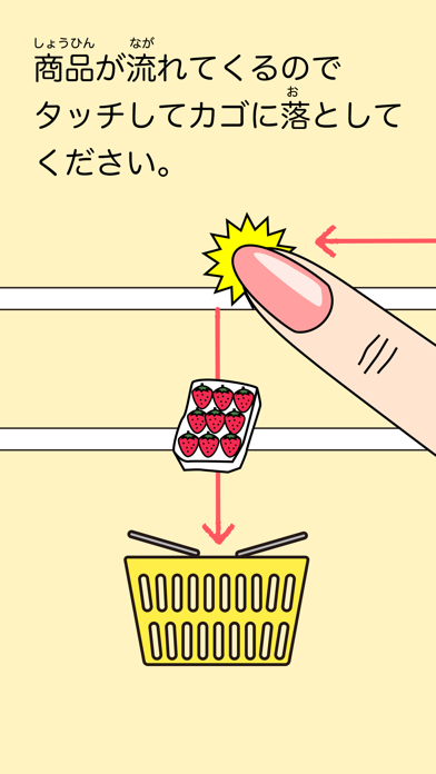 コンベアの上に乗せられて流れてくる商品。これらをタッチでタイミングよく買物かごに落としていくだけの簡単なゲームです。見事買物かごに落ちれば金額として加算されていき、制限時間内にどれだけ稼げたかを競います。