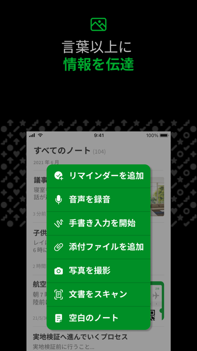 さまざまな形式のコンテンツを一つのノートに保存できます。テキストや文書、PDF、手書きメモ、写真、音声、Webクリップなど。これにより、アイデアや情報を一箇所に集約しやすくなり、情報の整理とアクセスが非常にスムーズになります。