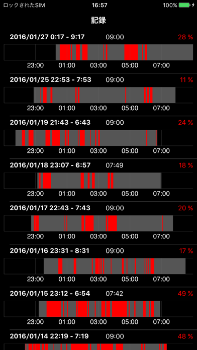 昼間の眠気はいびきが原因かも? 睡眠中の音を録音できるアプリです。ちょうどいびきをかいていた時間帯は赤線でマークされるので、そこだけを聴けば大丈夫。録音データは解析され、何が快適な眠りを邪魔しているかわかります。