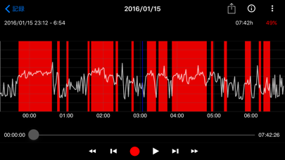 録音ボタンを押すと、いびきをかいている時間がわかります。赤くなっている箇所がいびきをかいている時間。聴きたいところに合わせて再生すると、自分のいびきを聴けます。