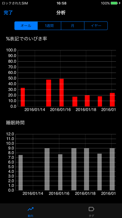 これまで記録したいびきのデータは分析ツールにまとめられます。ただ睡眠の質についてのデータが溜まっていかないのが残念なポイント。チュートリアルがないので最初は迷うかもしれませんが、徐々に慣れてくるでしょう。