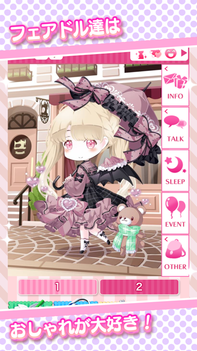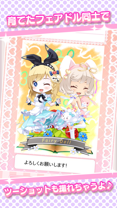 2頭身のかわいらしい「フェアリードール」を育てていく着せ替えゲーム。妖精とはおしゃべりもでき、「勉強」や「おつかい」の内容次第で性格も変化します。