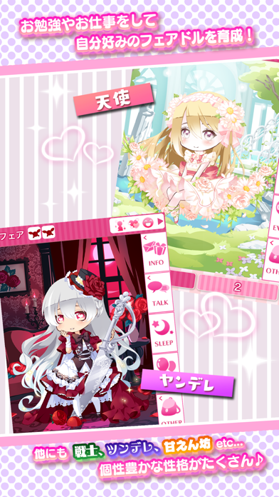 妖精を自分好みにアレンジ出来る育成着せ替えゲーム。色々と設定があるのですが、とても細かく出来ます。縦スクロールしないと完了ボタン等が下の方にあるので、最初は分かりにくかったです。おしゃべり・お仕事・お勉強とあり、やり込み要素が高く妖精に愛着湧きまくりです‼︎