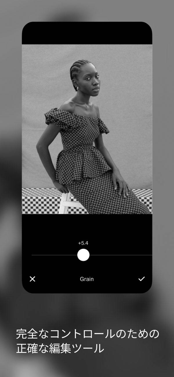 おしゃれなフィルターをワンタップで適用できる手軽さが魅力的。フィルターを選ぶだけで、トレンドのエモい雰囲気や洗練された雰囲気にガラッと変えられます。さらにフィルター効果の強さはスライドバーで調整できるため、写真加工の初心者でも自分好みの仕上がりに整えやすいです。