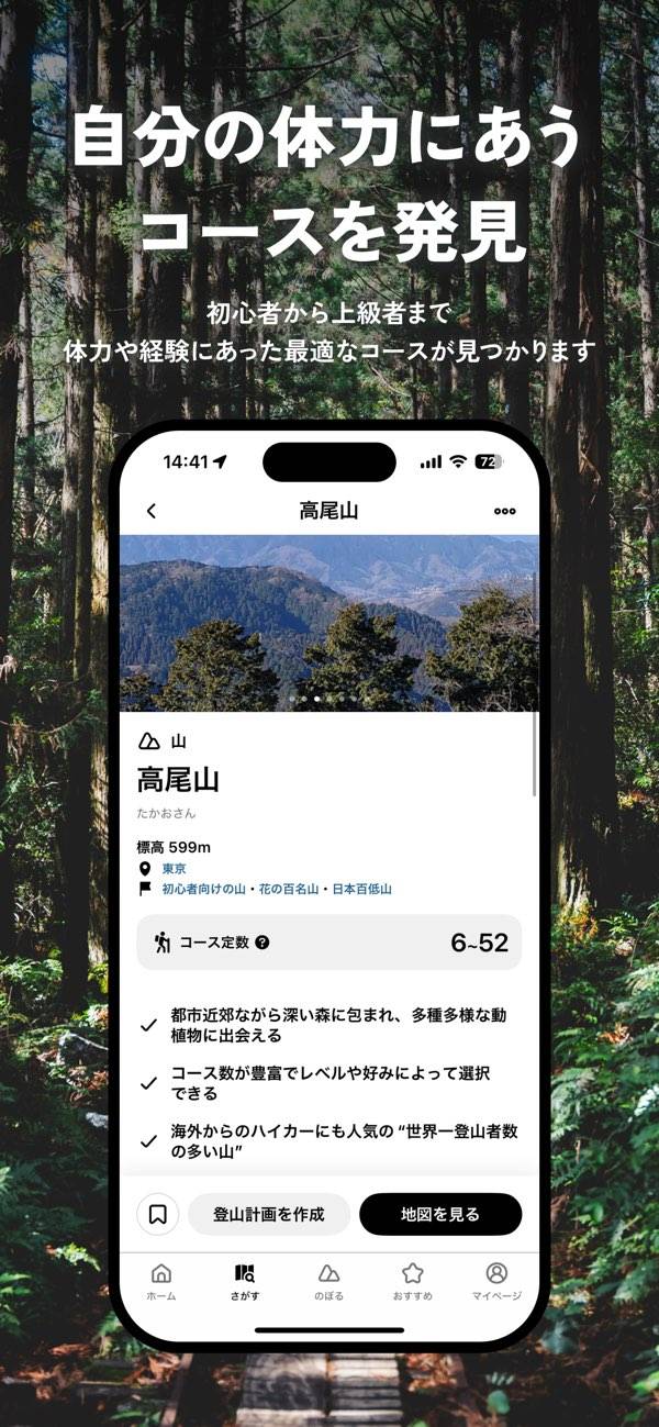 スタート地点と次のポイントをタップするだけで、コースタイムが自動で計算され、無理のない登山計画を立てられます。アプリに掲載されている登山情報はもちろん、ユーザーの活動日記を参考に、登りたい山を見つけてみましょう。