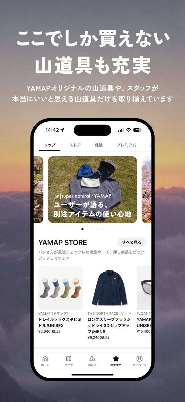 登山に関する情報が充実しており、これから登山を始めたい人にもおすすめです。登山文化をつくるメディアの“YAMAP MAGAZINE”や、アプリ限定のセレクトショップも収録。登山が楽しみになるようなコンテンツであふれています。
