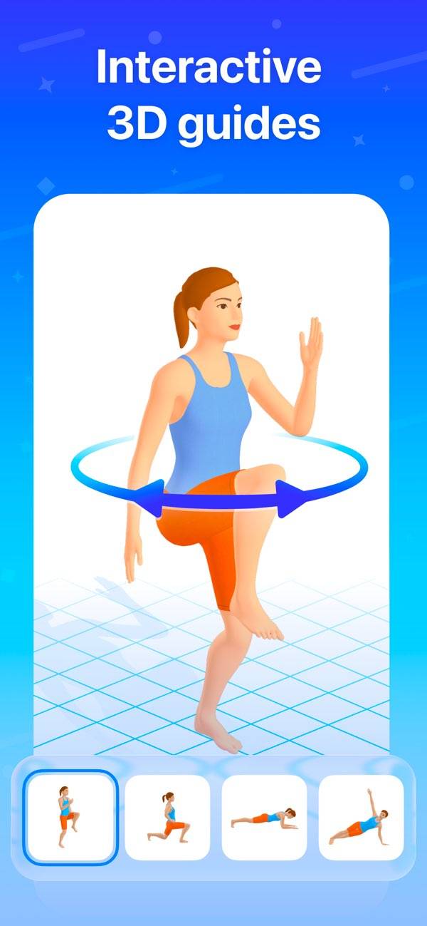 ワークアウトが始まると、今やっている運動を3D動画で表示。正しい動きがわかるので、初心者でも安心です。運動が切り替わるタイミングでは音を鳴らしてくれるため、必要なときにすぐ画面を見られます。