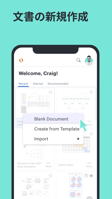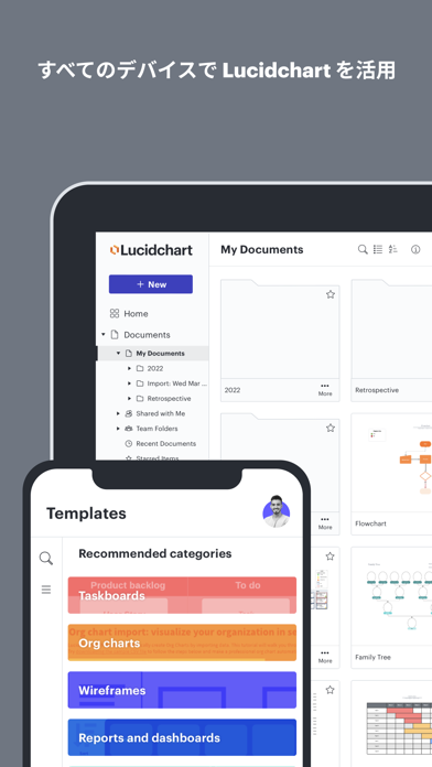 フローチャートやプロセスマップなどを、複数人で共有して作る作図アプリです。テンプレートを使ったり、ドラッグ&ドロップで一から図形を置いたりして、直感的な操作で作図できます。