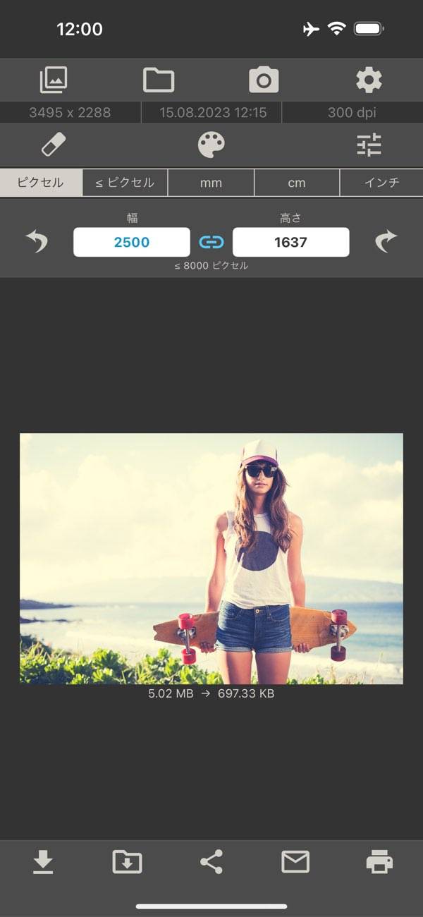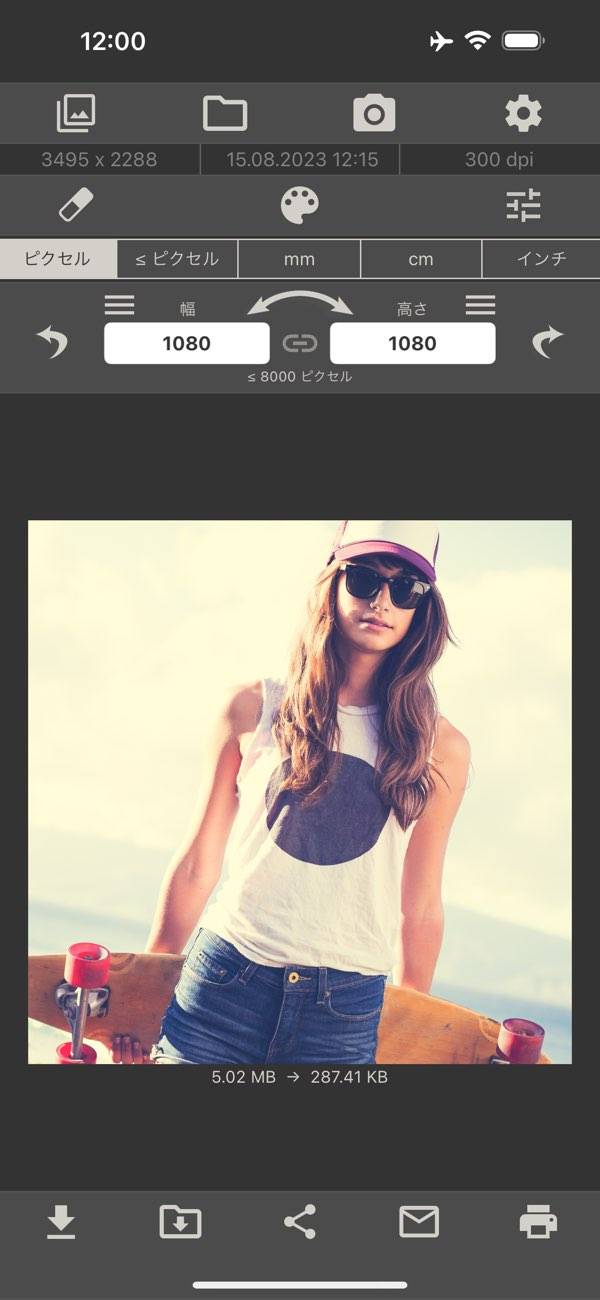 画像を選び、自由に数値を入力して大きさを変えられます。デフォルトサイズから選択することも可能。よく使うサイズを登録しておけば、次回使う時はワンタップで変換できます。