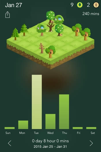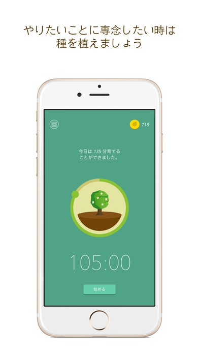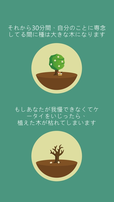 非常にシンプルで、木を植えて時間設定した間にスマホを使ってしまうと木が枯れてしまうアプリです。設定した時間をクリア出来るとコインがもらえ、いろんな種類の木や、サウンドを買えます。