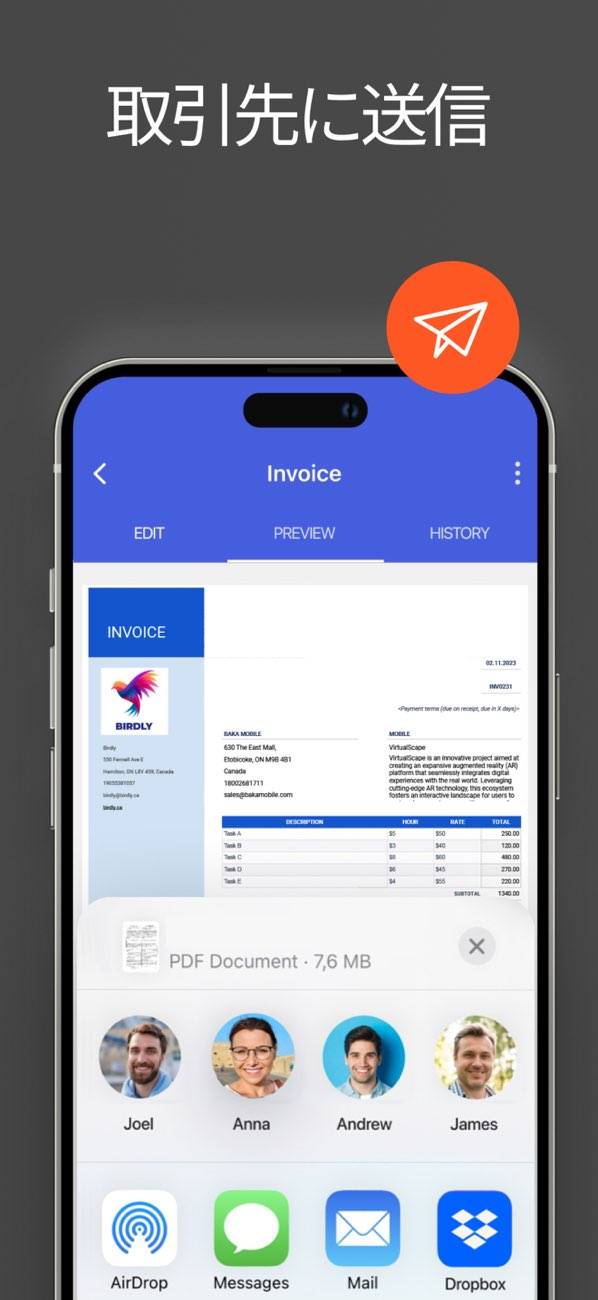 数秒でPDF形式の請求書をプレビューし、そのままメールで送信できます。ほかのメールアプリを立ち上げて請求書を添付する手間もなく便利。これにより、迅速にクライアントに請求書を届けることが可能です。