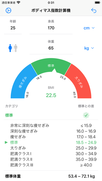 - 年齢、身長、体重を入力するだけで理想的な体重を確認することができる