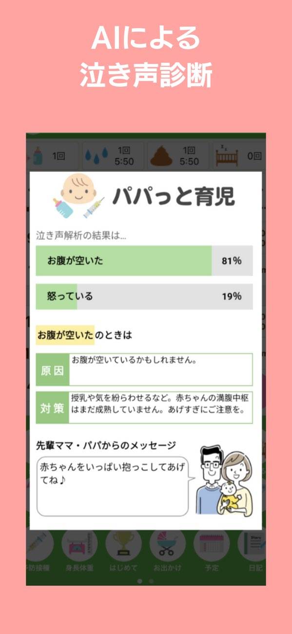 このアプリには、赤ちゃんの泣き声から感情を分析する機能が搭載されています。使い方は、とても簡単で画面右下に配置されたマイクのアイコンをタップするだけ。赤ちゃんが泣いている理由を正確に理解することで、適切な対応をとれるようになります。