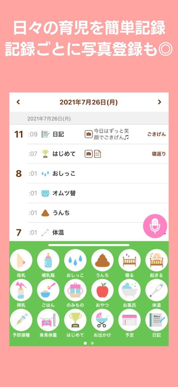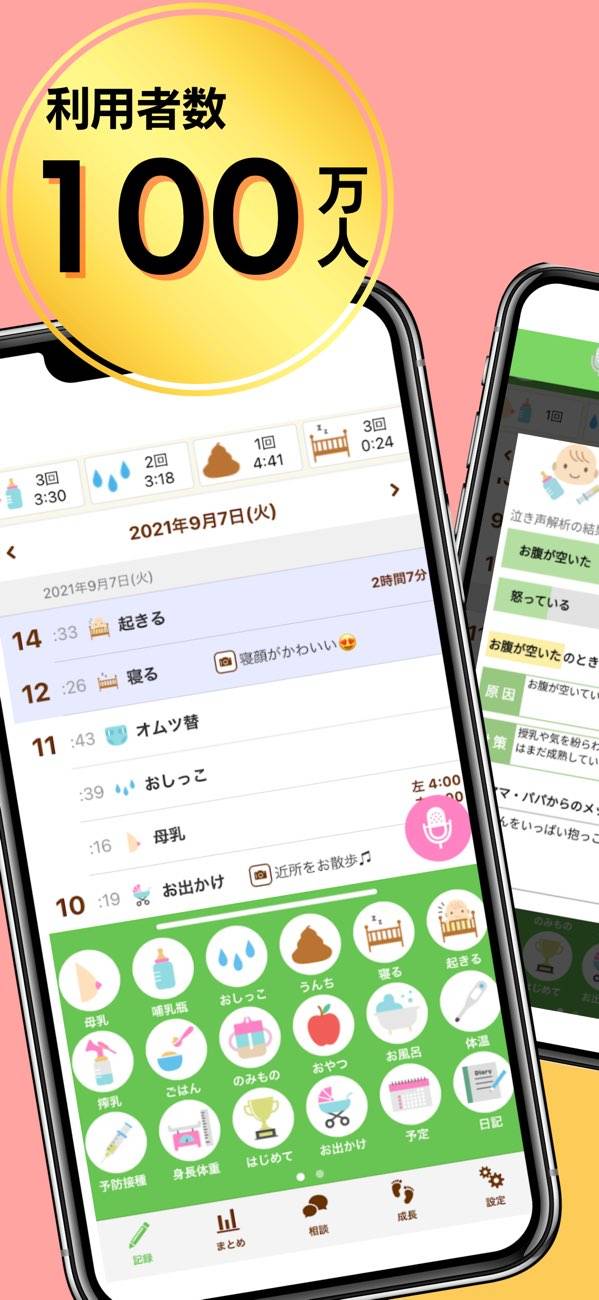 アイコンをタップしていく方法で、かんたんに育児記録がつけられます。また赤ちゃんの泣き声から感情を分析する、泣き声診断機能も搭載。「なんで泣いているのかわからない」そんなママ&パパの役に立つこと間違いなし!ごはんやお昼寝の時間を記録して、すくすく育つ様子を数値でも実感できるでしょう。