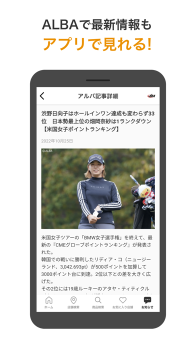最新のゴルフニュースやトーナメント情報を確認できる機能もあります。また、お得なキャンペーン情報もいつでもチェックできるため、ゴルフに関する最新情報を逃すことなく、賢くショッピングを楽しめます。ゴルフ情報のチェックツールとしてもおすすめです。