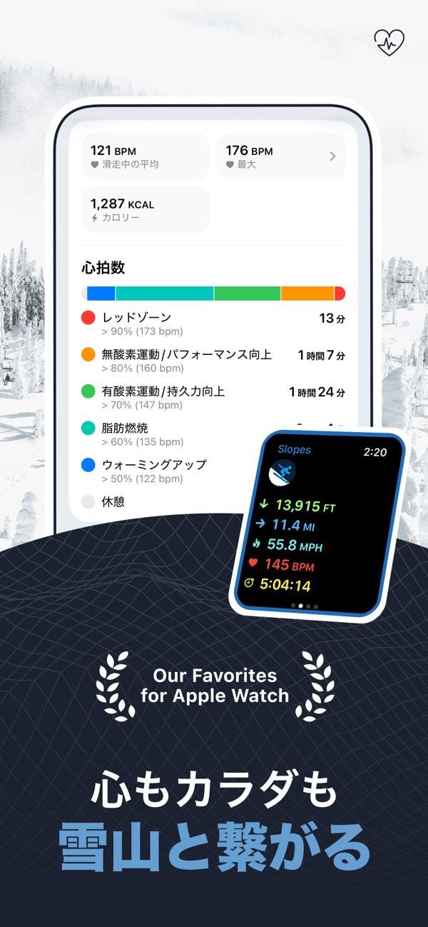 GPSを使って、スキーやスノーボードの滑走記録を残せます。滑走距離や時間、最高速度など、パフォーマンスを表すデータを計測できるため、上達度を確かめるのにも最適。さらにApple Watchと連携すれば、心拍数や消費カロリーも計測可能です。
