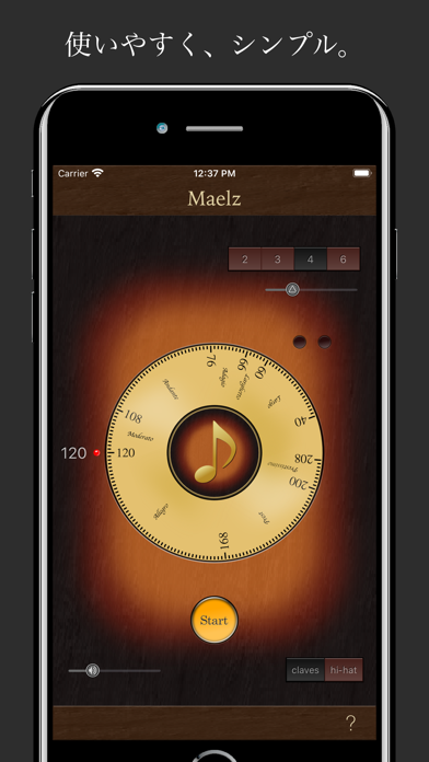 レコード盤を連想させるアンティークなデザインが素敵なメトロノームアプリ。テンポの設定は【♩=120】のような速度記号と【Adagio】のような標語、両方で行うことができます。クラシックの楽譜では特に標語が多様されていて、実際のテンポがわからない人は学びにもなるでしょう。