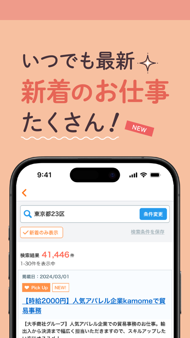 また条件保存機能を活用すれば、ワンタップで求人検索が可能。細かな条件で絞り込めるフィルター機能も充実しているため、自分に合った職を見つけやすいでしょう。