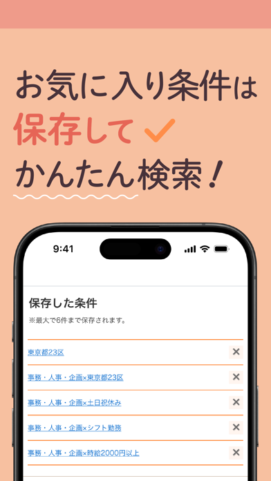 本アプリでは検索条件を最大5つ保存しておけます。一度保存しておけば再度入力する手間がなくなり、次回以降はワンタップで検索可能。これにより毎回面倒な条件入力の手間を省くことができ、さらに時間も節約できます。