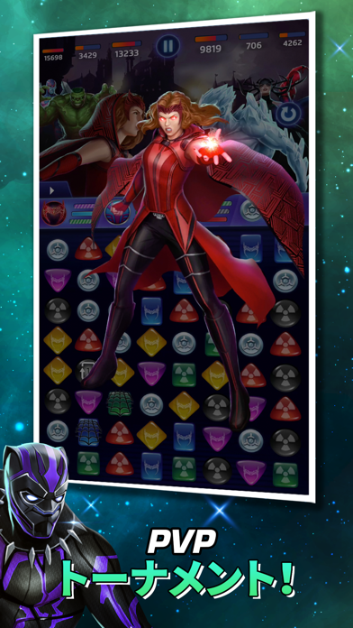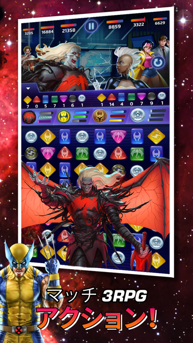 たくさんのマーベルキャラクターが登場するマッチ3パズル。隣り合ったアイコンを入れ替えて3つ以上つなげると敵に攻撃を行い、こちらが全滅するより先に相手を全滅させられれば勝利となります。バトルの最中にゲージが溜まると、キャラクターは必殺技を発動。迫力の演出とともに敵に大ダメージを与えられます。