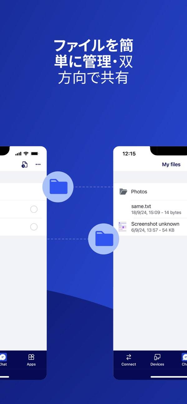 接続したPCとスマホの間で、ファイルの送受信を行えます。重要な文書やファイルをPCから取り出し忘れた場合も安心。逆にスマホで取得したファイルを、すぐにPCに送信・保存することもできます。