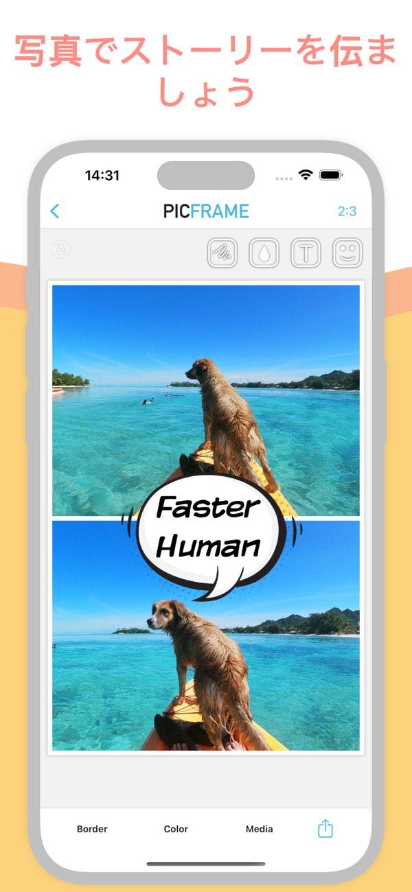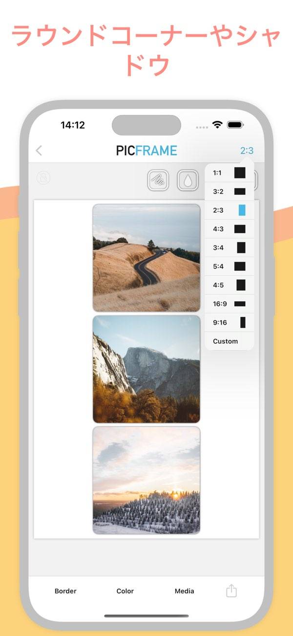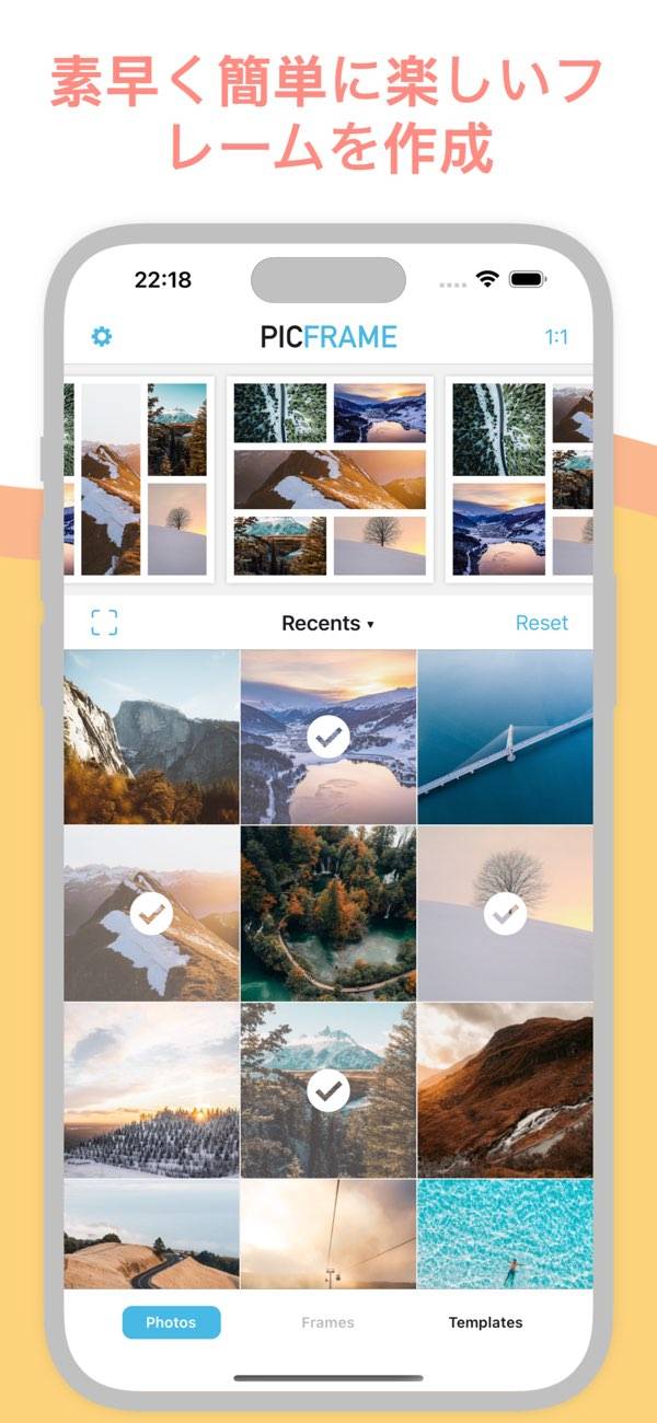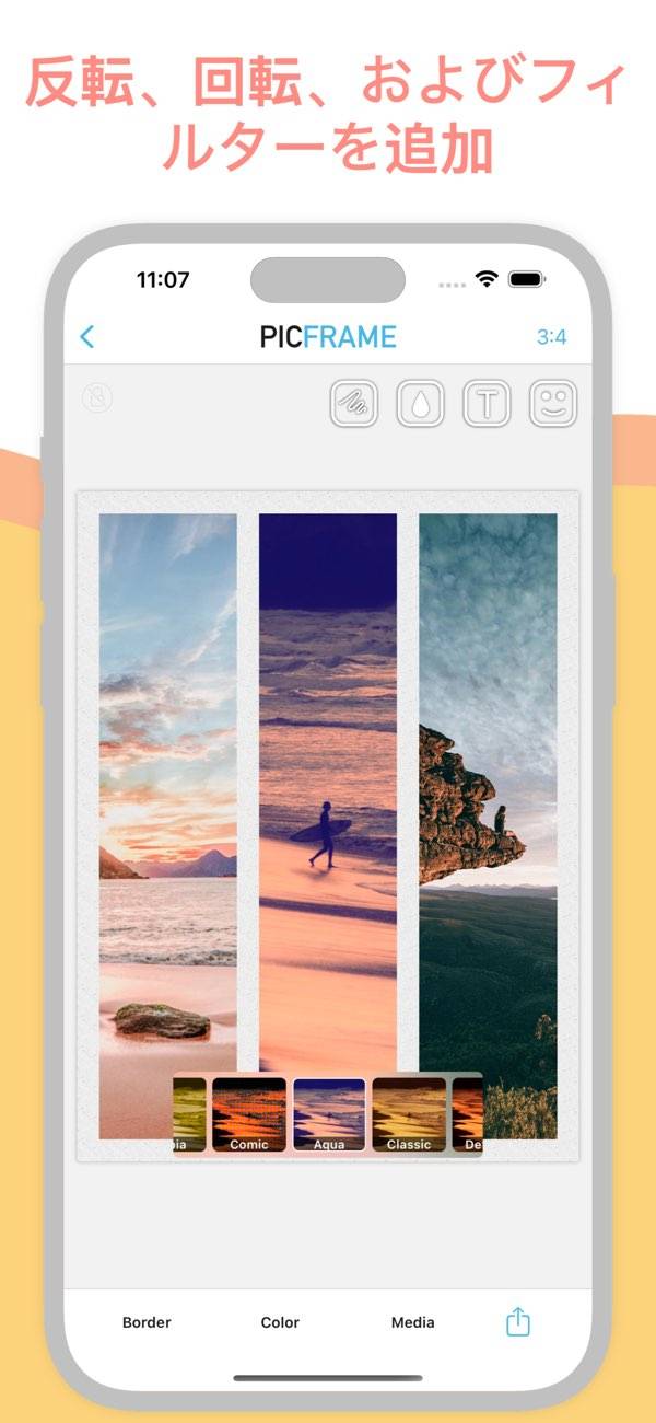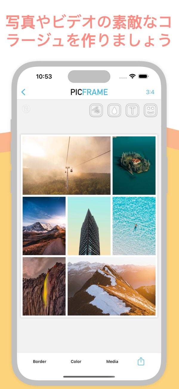画像とフレームデザインを選ぶだけで、コラージュ画像が完成。シンプルなデザインで使いやすいのが特徴です。また枠線の太さや色の変更、BGMを追加するといったカスタマイズ機能も搭載されています。