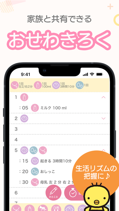 「授乳」「おむつ」「おふろ」「ねんね」など、その日の育児内容をかんたんに入力できます。入力した内容はパパや家族とも共有できるので、赤ちゃんの生活リズムをみんなで把握しやすくなるでしょう。体調の変化に気づくきっかけにもなるので、健診前の振り返りにも役立ちます。