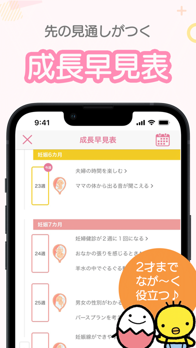 今日の赤ちゃんのようすやママのからだの変化について、妊娠週数に合わせた情報が毎日届きます。内容はすべて専門家やお医者さんの監修がされていて安心。「食べ物は何に気をつけたらいい?」「逆子のときの工夫は?」など、その時期に知っておきたいことがひと目でわかります。