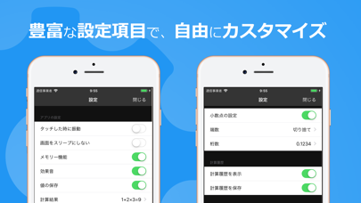 自分の好みに合わせてテーマを変更することが可能。これで、毎日の計算がより楽しくなります。テーマだけでなく、小数点の設定やタッチした時に振動するかなど細かな点まで変更することができ、自分だけのオリジナル計算機にできます。