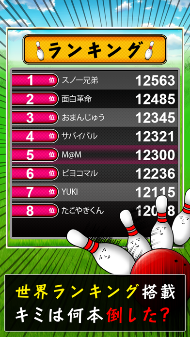 本作のルールとは「一列にズラッと並んだピンをどれだけ倒せるかを競う」というもの。画面奥に向かってフリックすることでボールを投げることができるので、思い切りいきましょう。簡単じゃんと思われるかもしれませんが、素早く且つまっすぐにフリックしないと好記録は生まれません。何度も挑戦してコツを掴んでください。
