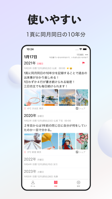 三年ほど使っています。今日は楽しかった!とアプリを開くと、去年の日記にも今日は楽しかったなんて書いてあったり。とても面白いです。そうか、この時期大変だったな、とか自分の日記ながら読むのが止まらない時もあります(笑)10年続けてもっと面白い日記にしていこうと思います。