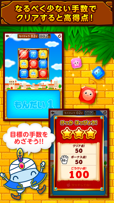 ゲームは1問ずつステージ制になっており、いつでも手軽にプレイできます。スコアによってつけられる評価は3段階。ミスをなくし、より少ない手番でクリアして、全ステージ☆3評価を目指しましょう。