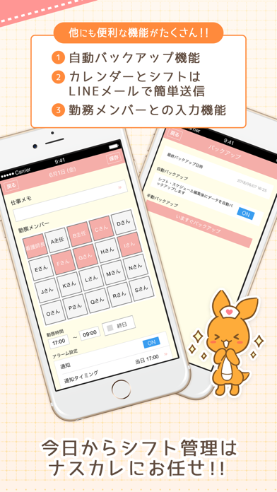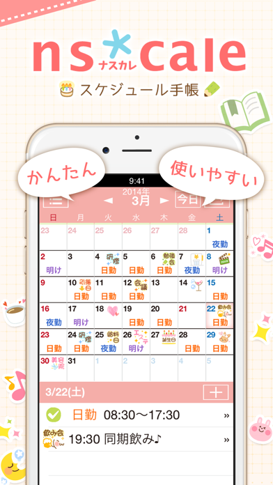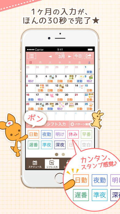 看護師ならではの独特なスケジュールに合わせたスケジュール管理アプリです。シフトの入れ方は、日勤、夜勤、早番など、選びたいシフトをタップするだけ。スタンプ感覚で、かんたんに入力できます。