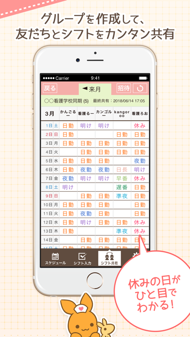 本アプリでは、シフトの共有もかんたんにできます。『看護roo!』という看護師のための総合サイトへの登録をすると、一緒に働く仲間とのシフト共有が可能に。仲間とのスケジュール調整が、より容易になるでしょう。