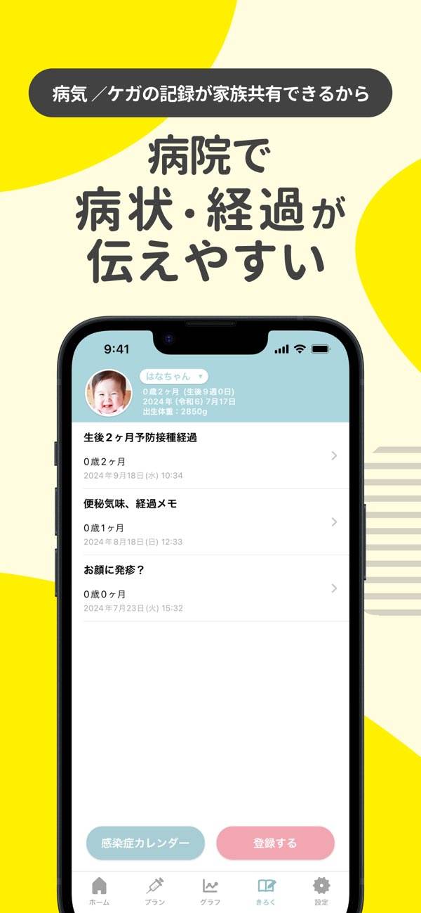 赤ちゃんの成長と一緒に、予防接種のスケジュールを管理。接種済みや未接種のワクチンを記録。QRコードで家族とも簡単に接種状況が共有できます。赤ちゃんのけがや病気など日々の様子も記録しておけるので、成長記録としても便利。
