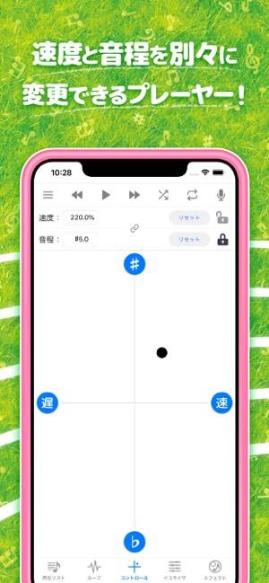 画面下の「コントロール」から、ピッチと速度の変更画面を開けます。黒い丸を縦方向にスライドしてピッチを、横方向にスライドして速度を変えられます。右上の錠前のボタンをタップすれば、片方の数値を固定したまま、もう一方をスムーズに調整可能です。