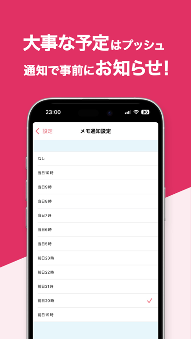 仕事とプライベート、2つのメモが入力できます。シフト表に「給料日」等のメモを直接表示することもでき、スケジュール帳としても便利。さらにメモのアラーム通知に対応しているので、重要な予定を忘れる心配がありません。予定管理が効率的になるでしょう。
