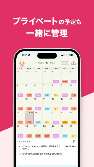 このアプリを使えば、1ヵ月分のシフトを簡単に入力できます。スタンプ感覚でシフトスケジュールを貼り付けるだけ。日勤・夜勤・深夜などのスタンプがそろっているため、新たに作る必要もありません。カレンダーは祝日にもしっかりと対応しています。