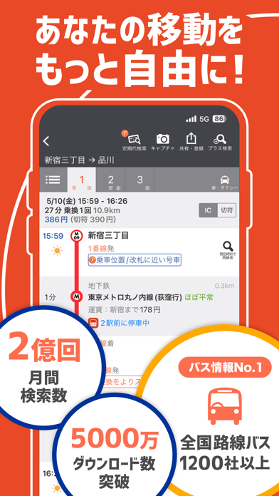 検索した電車がちょっと乗れるか怪しいなって時は、一本後の電車をワンタップで表示できたり、乗り換えにかかる時間も分かったりと痒いところに手が届く感じで、何も不満はないので今後も使い続けると思います。