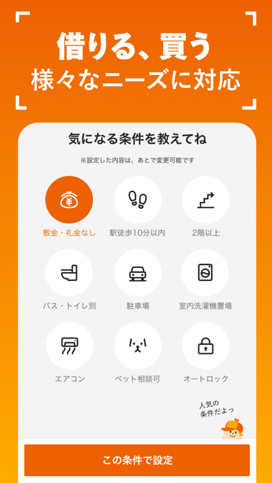 賃貸や持ち家など、希望に合わせた住まい探しが可能です。エリアや価格といった、ステップごとの条件を選ぶだけで、好みに沿った物件を絞り込み表示。一度検索した条件を保存しておけば、条件に合った新着物件の公開時に通知で知らせてくれます。