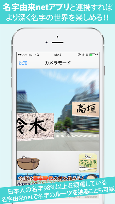表示された名字が気になったら、関連アプリ「名字由来net」でその由来をチェック。名字の背景に隠された歴史などを知ることができます。「こんなところに以外な由来を持つ名字が!」など、歴史好きにはどちらも必携のアプリです。