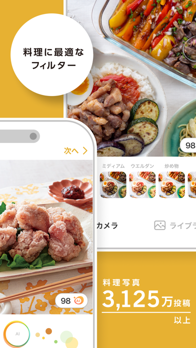 料理を撮るときに「ここだよ」とシャッタータイミングを教えてくれるAIカメラで、誰でもうまく撮影できます。カレーやデザートなど料理のジャンルに特化したフィルターも豊富で、写真に美味しさをプラス。写真は一覧カレンダーで見返せるので、毎日のごはん作りの励みにもなります。