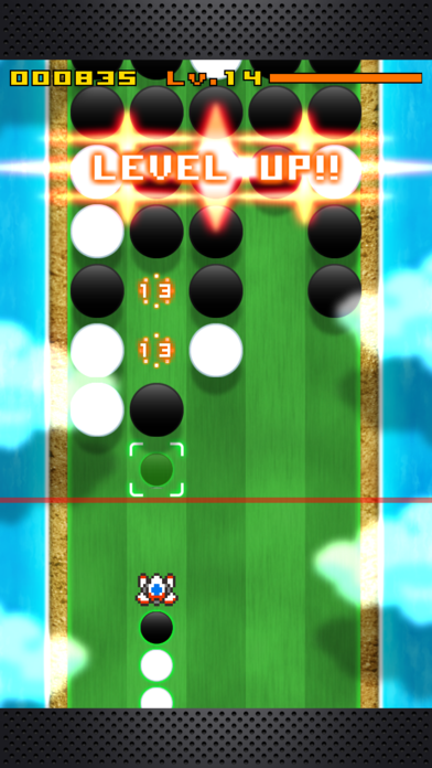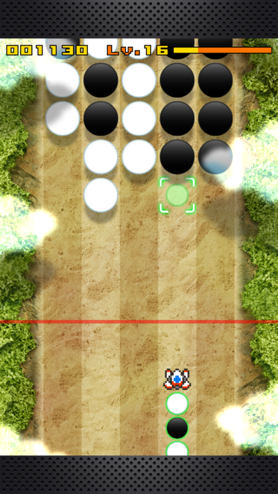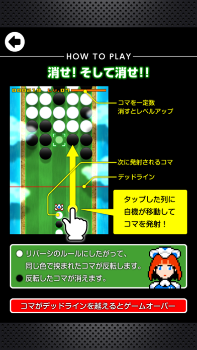 時間の経過とともにプレイヤー画面をだんだん圧迫するコマにやられないように次々とコマを消していきましょう。プレイヤーが操作する機体からは白か黒のコマが発射され、リバーシのように上手に色をはさむことができれば、ひっくり返してそのコマを消し去ることができます。
